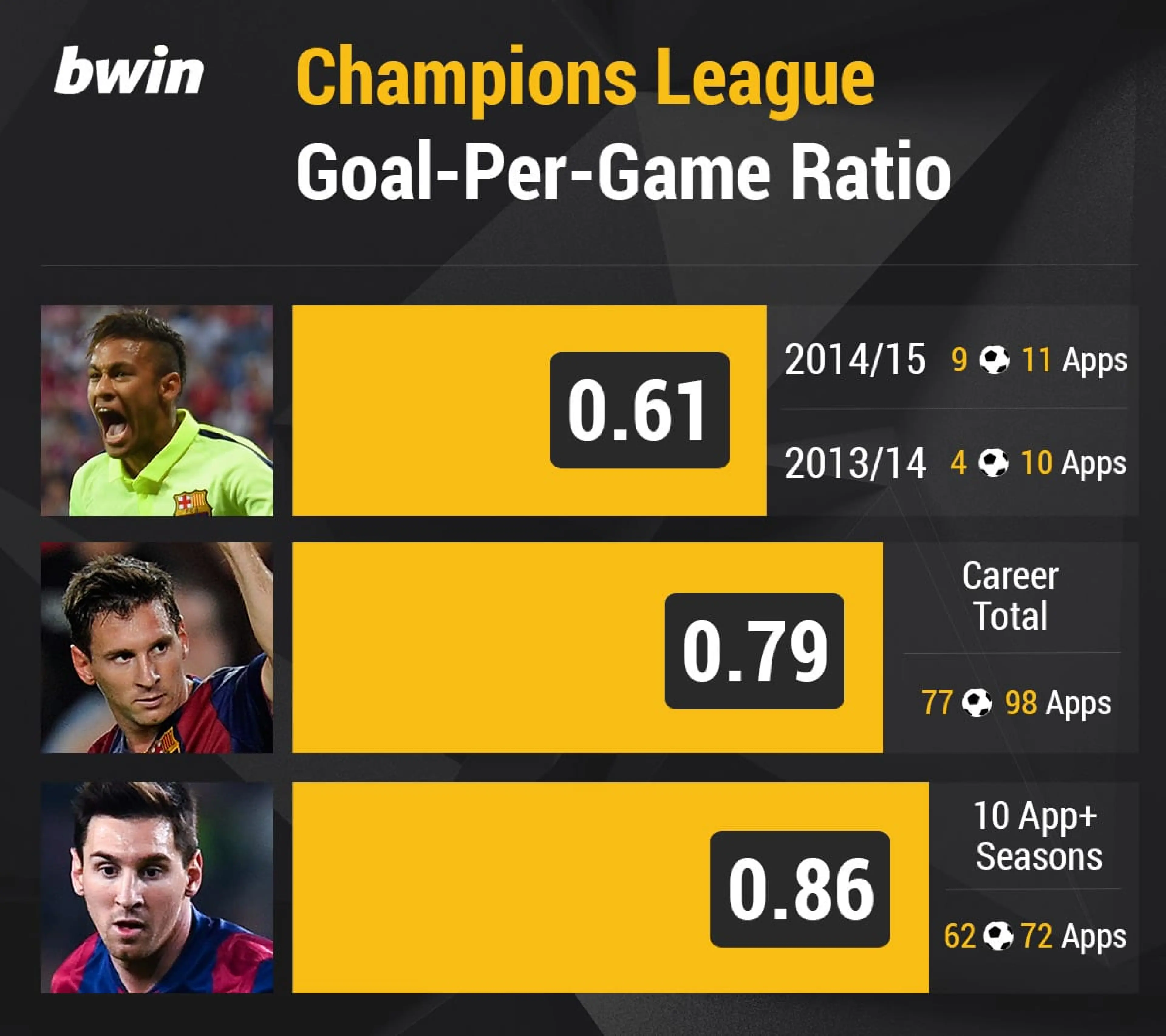 Indeed, in seasons that Messi has played ten times or more in the competition, as Neymar has in both his Barcelona campaigns to date, the Argentine’s quotient rises again, to an even more intimidating 0.86.